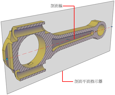 剖面物件具有一個透明的剖面平面指示器,用做切面。此平面可在由 3D 實體、曲面或面域組成的 3D 模型中移動,以獲得其他剖面視圖。