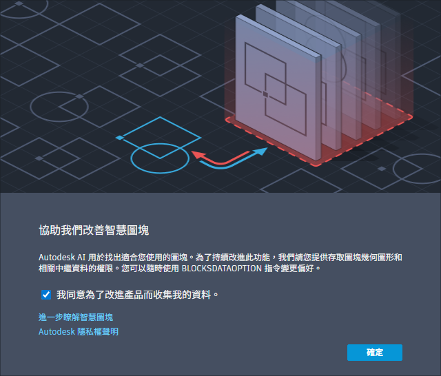 第一次完成智慧圖塊工作流程後,會顯示「同意資料收集」對話方塊。同意資料收集後,工作流程中使用的內容資料會與 AutoCAD 分享。