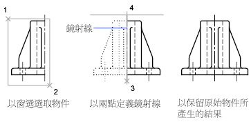 繞被稱作鏡射線的軸翻轉物件以建立鏡射影像。若要指定這個暫時鏡射線,請輸入兩點。您可以選擇是刪除還是保留原始物件。