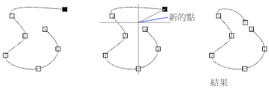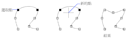 - 將節點和擬合點加入雲形線上的指定位置,此作業不會維持該點的切向或曲率連續性。