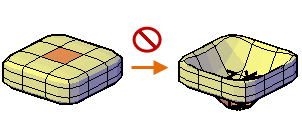 但是,網面擠出會插入附加面,以封閉擠出的面與其原始網面曲面之間的間隙。使用網面擠出時,您可以指定相鄰面是否可作為一個單位擠出 (接合) 或是單獨擠出 (不接合),如以下插圖中所示。