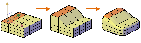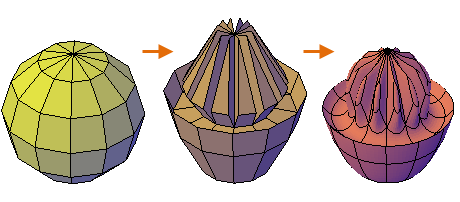 網面平滑度為 3D 網面的物件特定性質。未平滑化網面的平滑度等級為 0,而網面平滑度可以提升至 256,雖然網面通常僅使用等級 1 到 4。在下方插圖中,會透過掣點編輯和擠出,然後再平滑化來修改網面圓球。