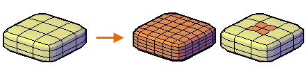 當您細分網面時,會將一個或多個面分割為較小的面,以獲得更精細的控制。但是,由於增加了面數,您增加了模型的整體複雜性。此外,細分整個網面物件會將基準平滑度等級重置為 0。此變更會產生無法再簡化的密集格線。為獲得最佳結果,請避免細分物件,而僅細分或分割需要更詳細地進行塑型的個別面。以下插圖展示平滑網面方塊已完全細分,或僅細分一個面的結果。