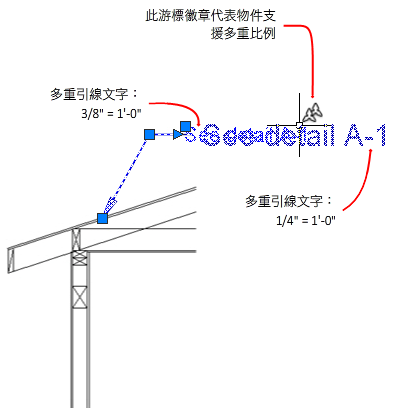 下圖展示您指定了兩種不同的物件比例的多重引線。