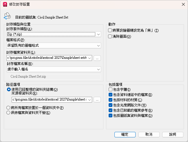 所有相關聯的字體檔 (TXT 與 SHX) 將包括於封存套件中。