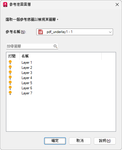 使用 DWFLAYERS、PDFLAYERS、DGNLAYERS 或 ULAYERS 指令或在選取的參考底圖上按一下滑鼠右鍵,並於快顯功能表上按一下圖層。