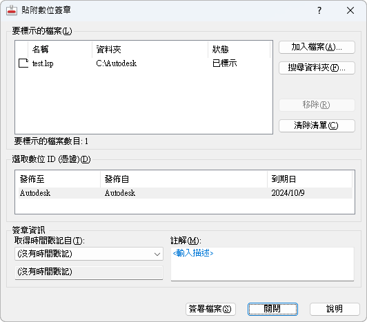 將數位簽章貼附至此對話方塊中列示的每一個檔案。