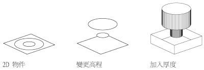 物件的 3D 厚度是物件在其所在 3D 位置向上或向下延伸的距離。正厚度在 Z 正方向延伸;負厚度向下延伸 (Z 反向)。