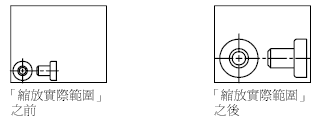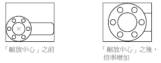 可以拉近與拉遠來變更視圖的倍率,這與使用相機來拉近和拉遠相似。使用 ZOOM 不會變更圖面中物件的絕對大小。其僅變更視圖的放大倍率。