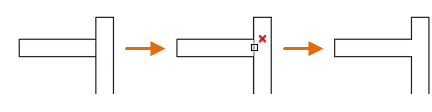您可以將物件修剪至它們與其它物件最近的交點。按 Enter,而不是選取切割邊。這樣,當您選取要修剪的物件時,顯示的最近物件會做為切割邊。在此範例中修剪了牆面以使它們可以平滑地相交。