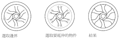 註: 若要選取包括圖塊的切割邊與邊界邊,您可以只使用單一選取,即「框選」、「籬選」與「全選」選項。