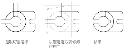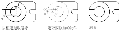 修剪數個物件時,使用不同的選取方式可以協助您選擇目前要修剪的切割邊與物件。在下列範例中,切割邊是透過框選選取的。
