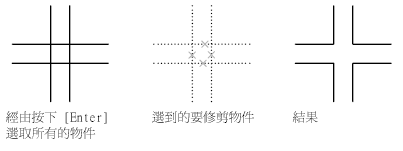 啟動 TRIM 或 EXTEND 指令後,只需選取要修剪或延伸的端點附近的物件即可。選取物件有三個預設選項: