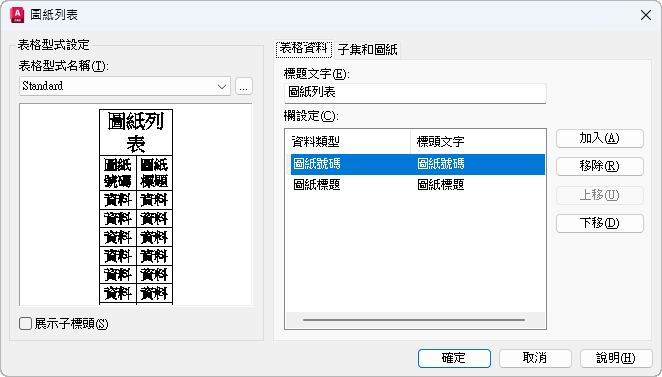 註: 如果「模型」頁籤處於作用中的狀態,或目前配置不是目前圖紙集中的圖紙,則無法使用圖紙集快顯功能表上的「插入圖紙列表」。