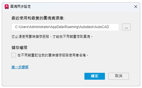 「圖塊」選項板底部的「圖塊同步設定」按鈕是動態的,指出最近使用和我的最愛圖塊是否已同步到雲端儲存空間中。