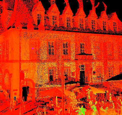 風格化點雲可協助您分析點雲中的特徵。您可以根據原始掃瞄顏色、AutoCAD 物件顏色和點的法線方向進行風格化,如果所需的資料存在於點雲中,您也可以根據鐳射脈衝回波強度、高程或 LAS 分類資料進行風格化。
