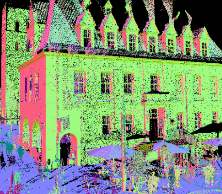 使用指定給點雲 X、Y 和 Z 方向的內建顏色,而一般風格化會根據該點法線的方向,將這些顏色的其中一種指定給每個點。在圖面中,法線越是靠近 X、Y 或 Z 的方向,點顏色就會越接近指定給該軸的顏色。
