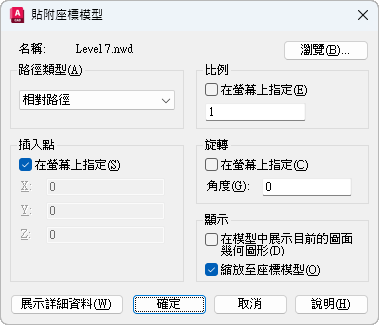 顯示貼附座標模型檔時,檔案與圖面一同儲存的路徑。路徑取決於「路徑類型」設定。