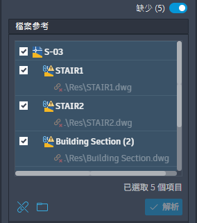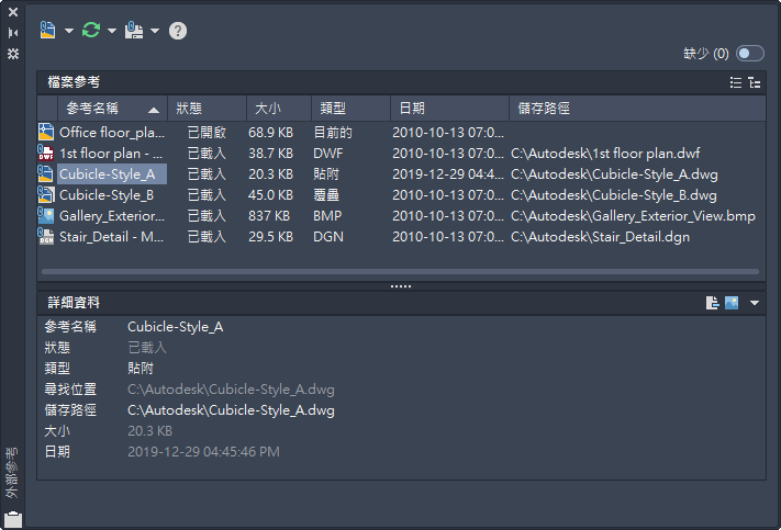 當目前圖面中沒有缺少的參考時,將顯示此選項。按一下後,顯示所有貼附的參考狀態就會啟用,您可以查看貼附到目前圖面的所有參考。