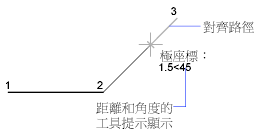 使用 PolarSnap™ 沿極座標對齊路徑鎖點至指定距離。例如:在下圖內,繪製一條兩個單位長度的線,從點 1 到點 2,然後以與此線成 45 度角畫一條兩個單位長度的線到點 3。如果您打開 45 度極座標角度增量,當游標經過 0 或 45 度角時,會顯示對齊路徑與工具提示。當您將游標移開該角度時,對齊路徑與工具提示都會消失。