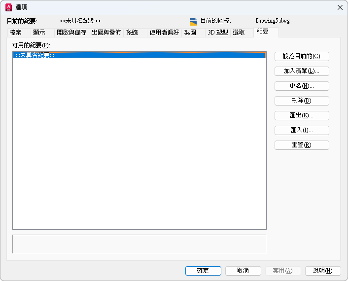 顯示「變更紀要」對話方塊,以變更所選紀要的名稱和說明。您要重新命名紀要,但仍要保留它的目前設定時,請用「更名」。