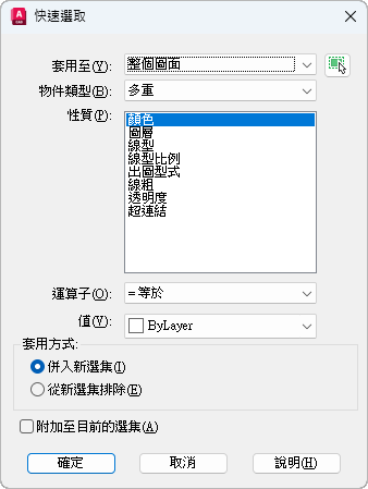 如果已選取「附加至目前的選集」,篩選條件便會套用到整個圖面。