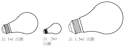一般說來,您都以實際大小來繪製物件。也就是說,您決定如何解譯單位的大小 (一英吋、一公釐、一公尺) 並以 1:1 的比例繪製。例如,如果您的測量單位是公釐,您圖上的每一個單位即代表一公釐。當您出圖圖面時,您指定精確的比例,或是將影像佈滿圖紙。