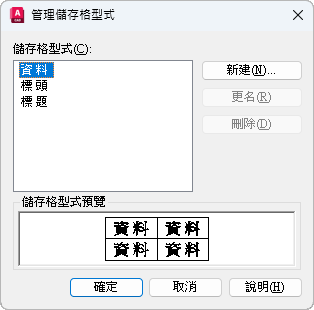 顯示目前表格型式中的所有儲存格型式,並可讓您建立和刪除儲存格型式。
