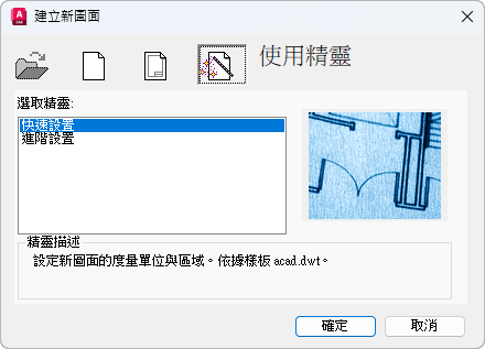 使用英制或公制預設設定從頭開始建立新圖面。「使用樣板」使用您在圖面樣板中所定義的設定,來建立新圖面。使用「精靈」建立新圖面,該圖面使用您在「快速」或「進階」精靈中指定的設定。(透過 NEW 指令無法使用該對話方塊中的第一個選項,即「開啟圖面」。)若要開啟既有的圖面,請使用 OPEN。)