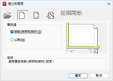 根據英制測量系統來啟動一個圖面。預設圖面邊界 (格線限制) 為 12 × 9 英吋。