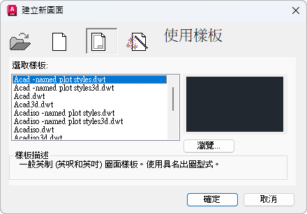 列示圖面樣板檔案位置 (在「選項」對話方塊中指定) 中目前存在的所有 DWT 檔案。選取一個檔案做為新圖面的起點。
