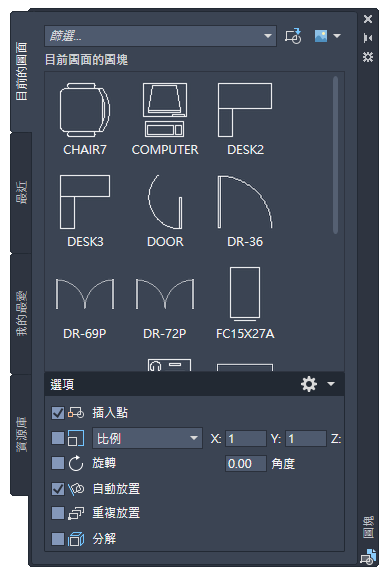 您也可以透過開啟對應頁籤的「圖塊」選項板,插入最近使用的圖塊、我的最愛圖塊以及資源庫中的圖塊。下圖顯示所有四個頁籤。