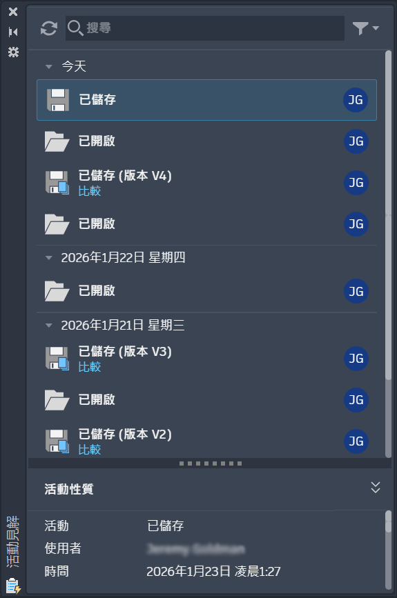 開啟「活動見解」選項板,以檢視目前圖面的活動。