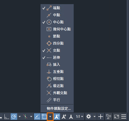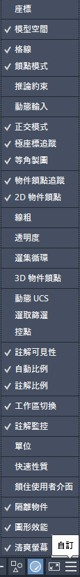 在指令行上輸入 STATUSBAR,輸入 1 可顯示狀態列,輸入 0 可隱藏狀態列。
