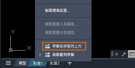 在「模型」或「配置」頁籤上按一下右鍵,然後選擇停靠在狀態列之上,或停靠在狀態列之內。