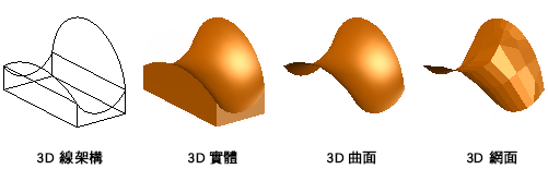 AutoCAD 中的 3D 塑型包括 3D 實體、曲面、網面和線架構物件。