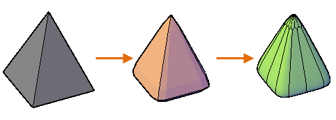 3D 模型可包含這些技術的組合,而您可以在它們之間進行轉換。例如,您可以將基本型 3D 實體角錐轉換為 3D 網面來執行網面平滑度。然後,您可以將網面轉換為 3D 曲面或回復為3D 實體以利用其各自的塑型特徵。