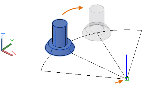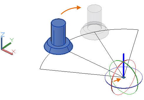 多數用於 2D 作業的 AutoCAD 指令可以套用至 3D 模型。例如,使用 ROTATE 指令,您可以圍繞平行於 UCS Z 軸的軸迴轉 3D 實體。如果要將模型圍繞不同的軸線方向旋轉,您需要變更 UCS 的 Z 軸線方向。