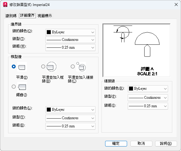 設定詳圖的詳圖邊界線、模型邊和連接線性質。