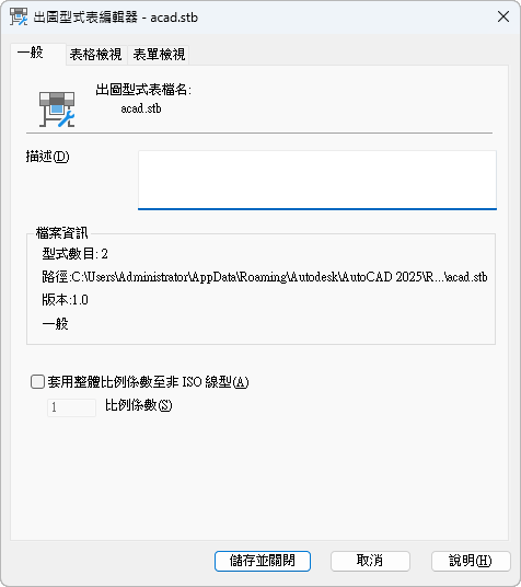 在此出圖型式表所控制的物件出圖型式中,調整全部的非 ISO 線型及填滿樣式。