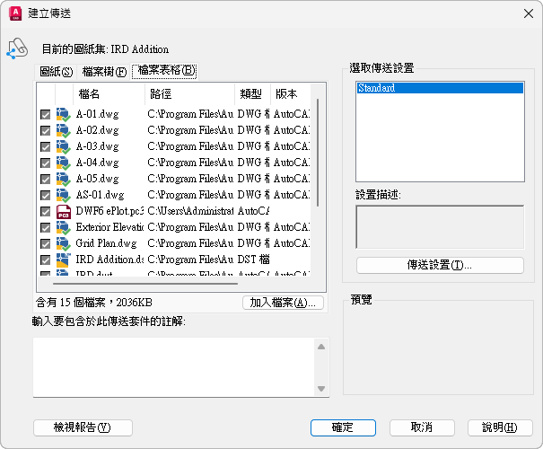 依預設,目前圖面的所有相關檔案 (如相關的外部參考、出圖型式和字體) 都會列出。您可以將檔案加入到傳送套件中,也可以移除既有的檔案。URL 所參考的相關檔案不會併入傳送套件。