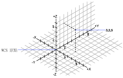 在下面的圖解中,座標 (3,2,5) 指定一點沿正 X 軸 3 個單位、沿正 Y 軸 2 個單位以及沿正 Z 軸 5 個單位。