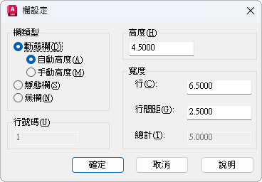 MTEXT (指令) 查找:「文字編輯器」頁籤 > 「插入」面板 > 「欄」 > 「欄設定」