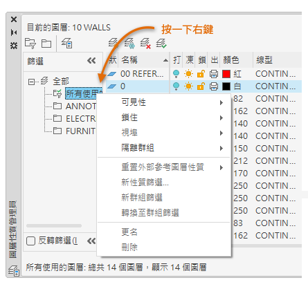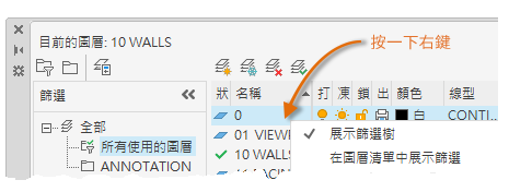 移除選取的圖層篩選。您無法刪除「全部」、「所有使用的圖層」或「外部參考圖層」篩選。