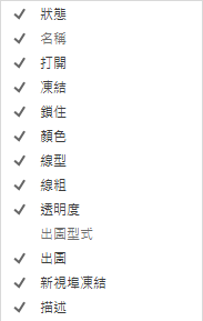 依名稱列示所有欄。勾選標記表示該欄會包含在顯示中。按一下欄名稱以顯示或隱藏欄。僅當配置視埠處於作用中時,可以使用視埠凍結、視埠顏色、視埠線型、視埠線粗以及視埠出圖型式。