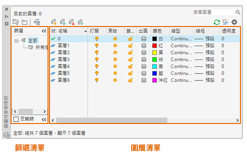 顯示圖面中的圖層篩選清單。按一下
