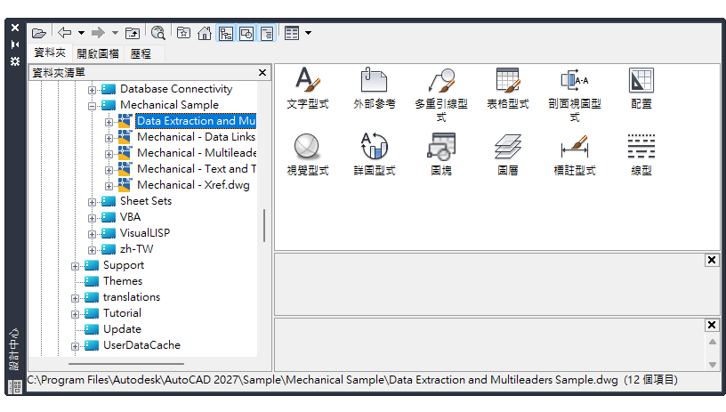 使用左側的樹狀檢視可以瀏覽內容的來源,並於右側內容區域顯示內容。您可以使用內容區域將項目加入圖面或工具選項板。預覽或描述會針對選取的圖面、圖塊、填充線樣式或外部參考加以顯示。