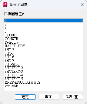 顯示依字母順序列示的圖層清單,所選圖層或物件可在這些圖層上合併。