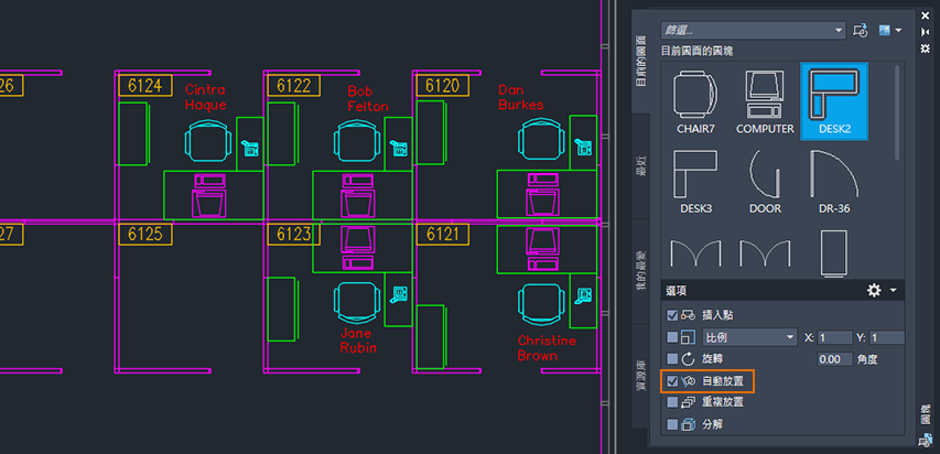 自動放置圖塊功能根據圖面中先前圖塊實例的類似幾何圖形和學習模式提供建議,可讓您使用「圖塊」選項板輕鬆插入圖塊。