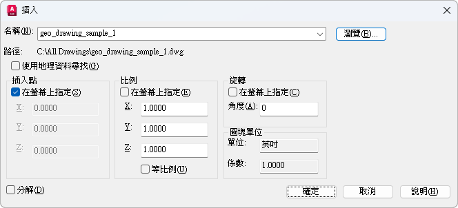 指定要插入的圖塊名稱,或要插入做為圖塊的檔案名稱。